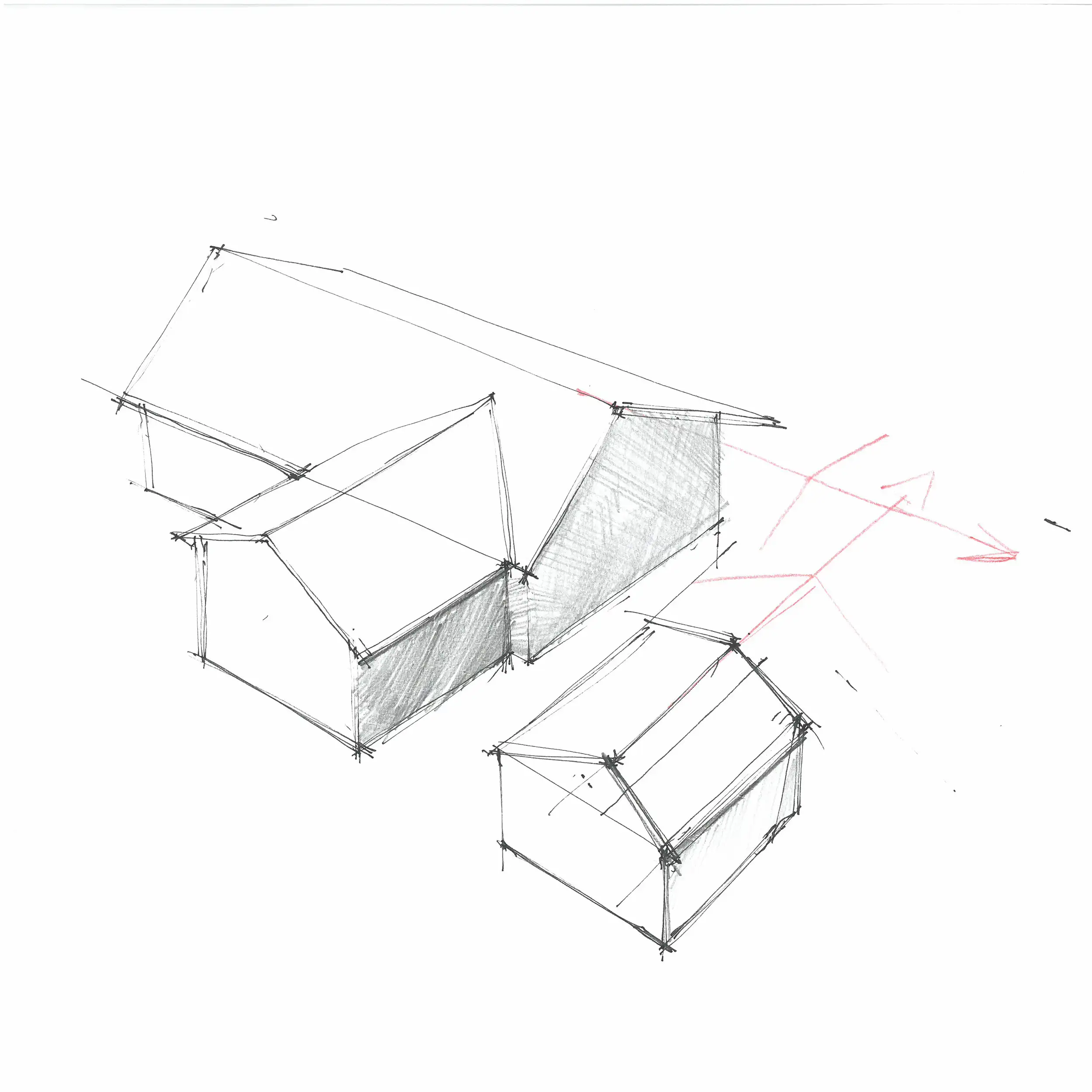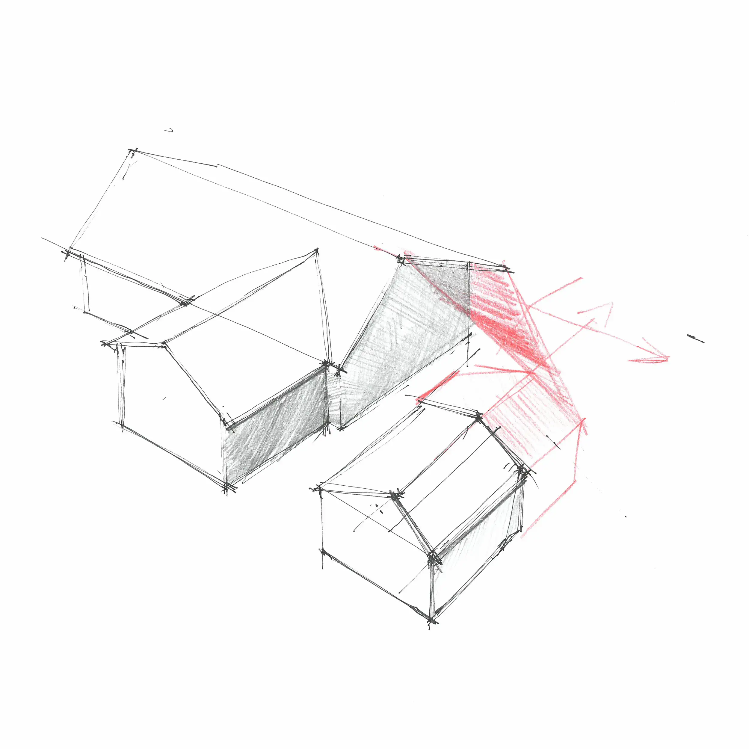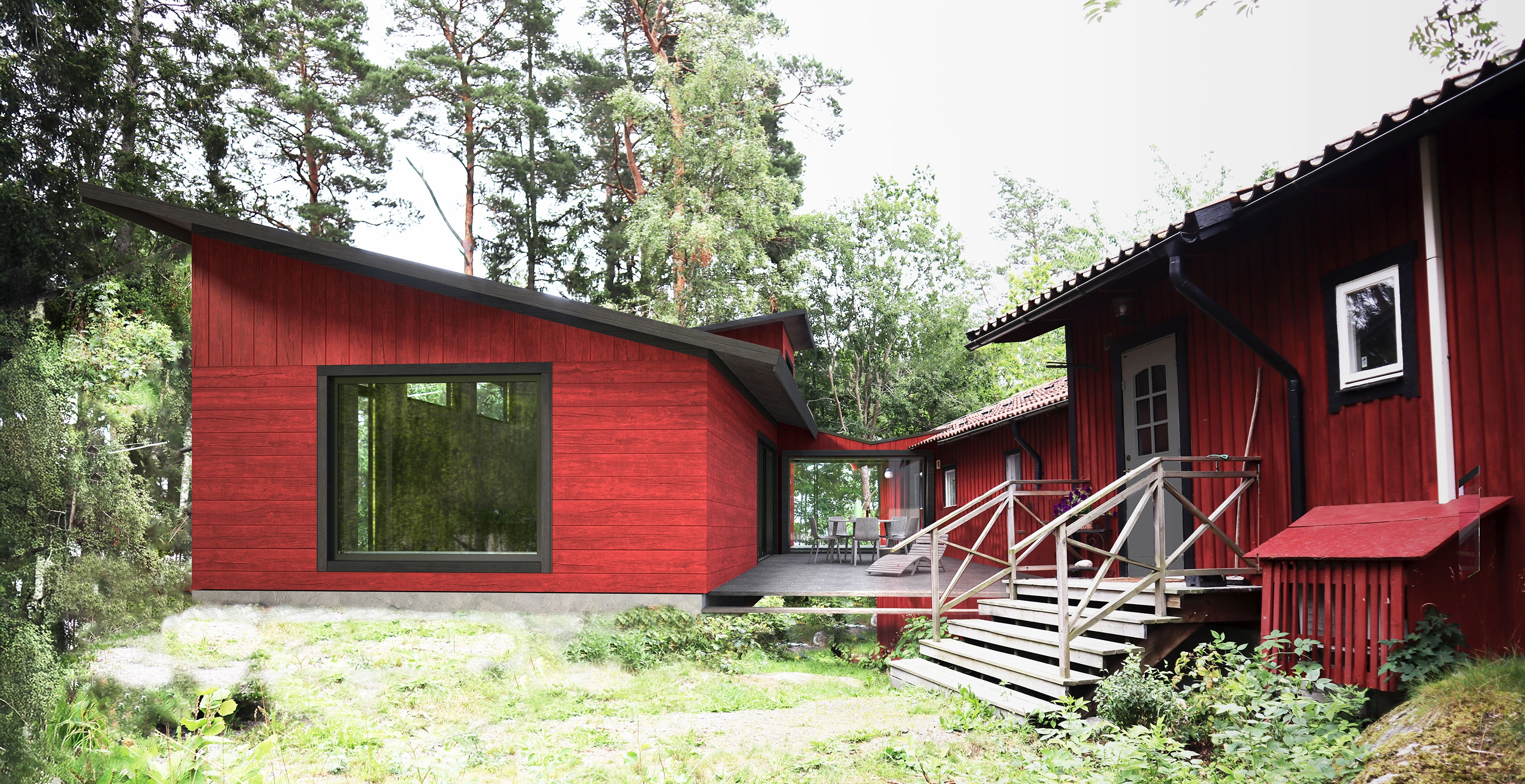 Vår strategi har varit att lägga till ytterligare volym till de befintliga huskropparna och genom det skapa en terrass i utrymmet mellan dem. Tillbyggnaderna får ett modernt uttryck, men vi har valt att behålla samma färg som de ursprungliga byggnaderna – den karakteristiska för området Falu rödfärg.