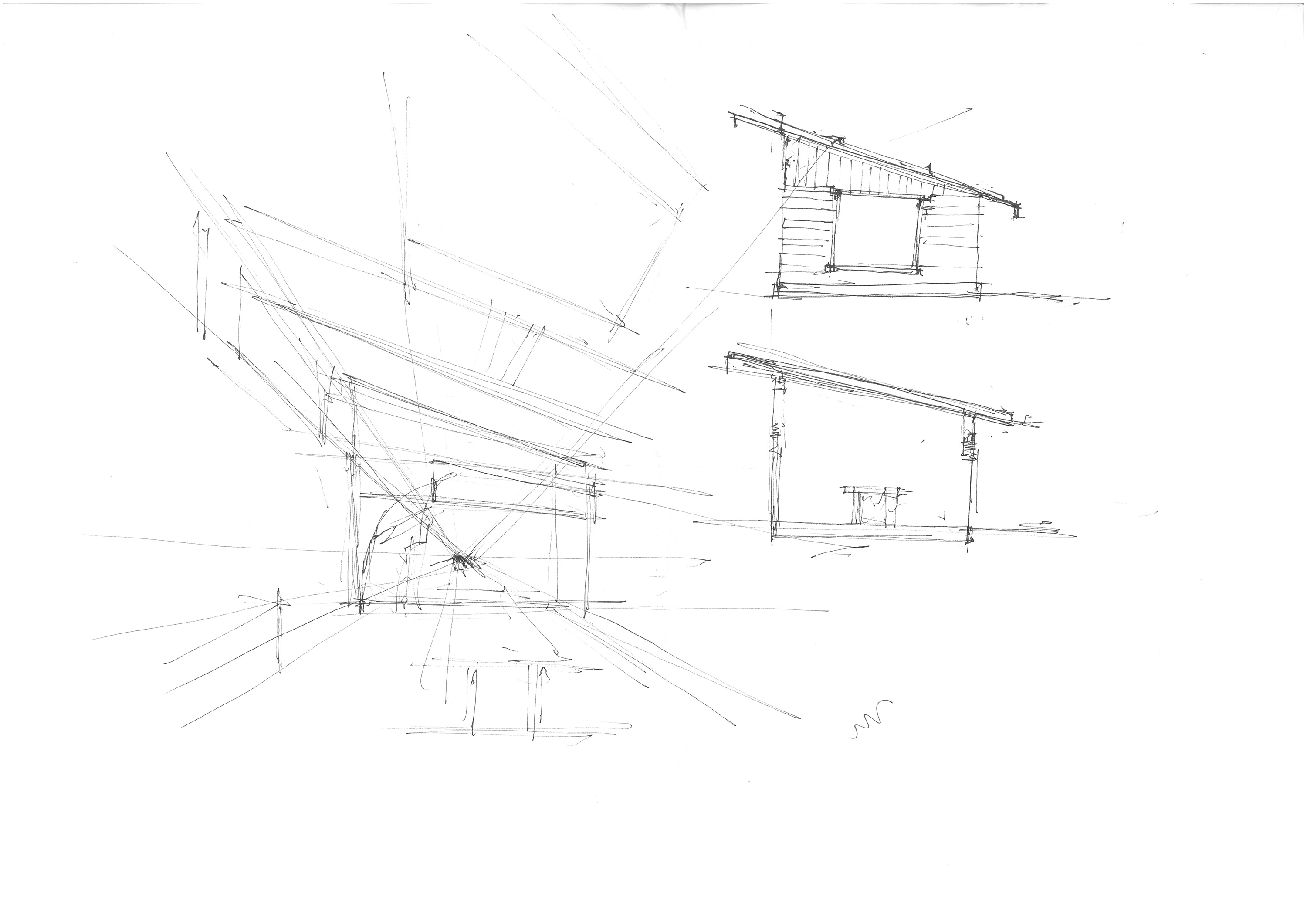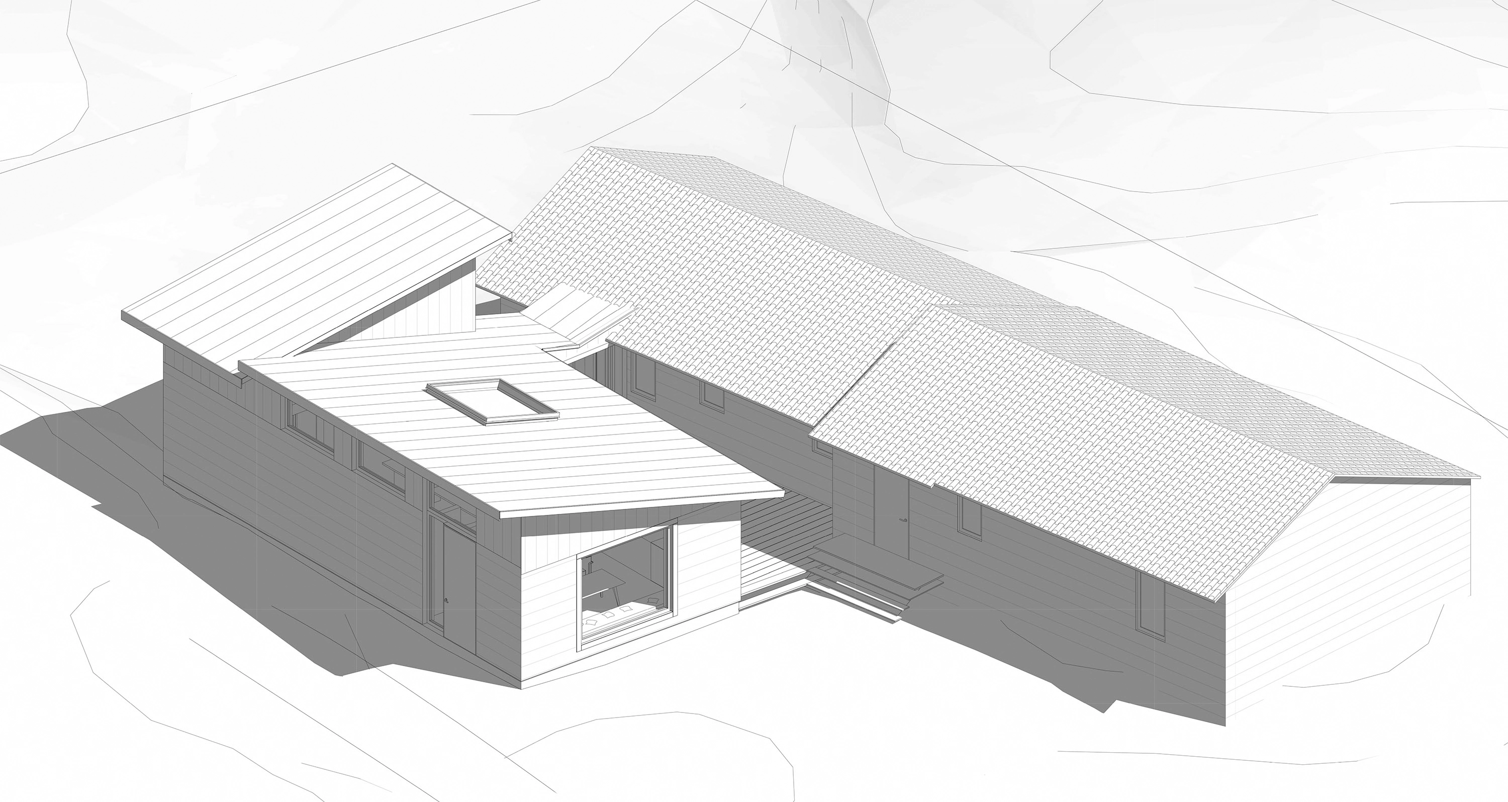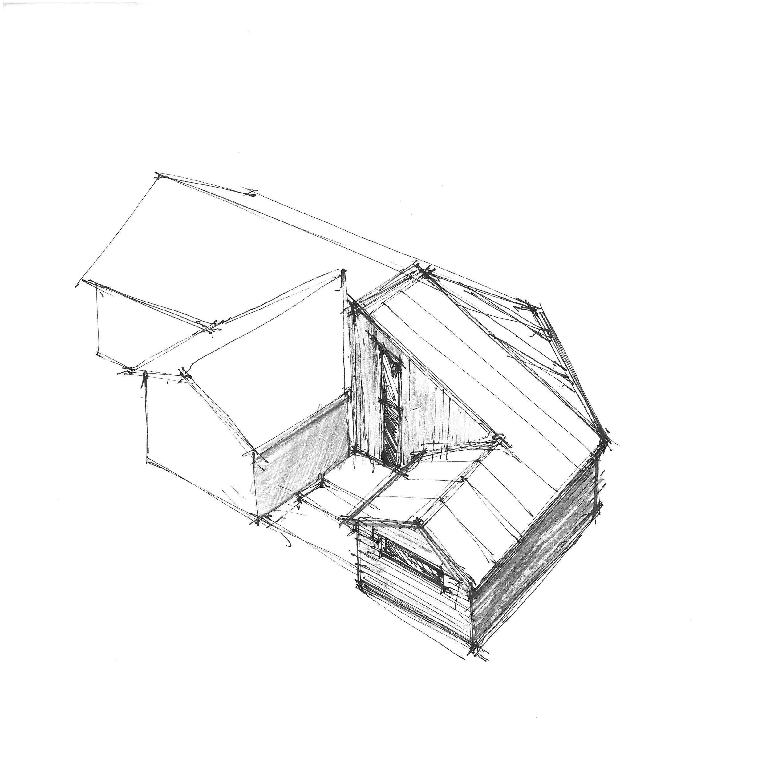 Husens geometri återspeglar funktionen invuti, med öppna ateljéytor och sovloft på övre våningen. Det nya och det gamla binds samman genom en glasad korridor, och takens utformning möts i två sammanfallande takvinklar.